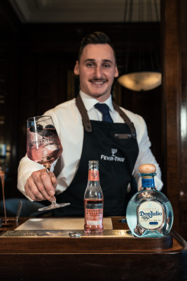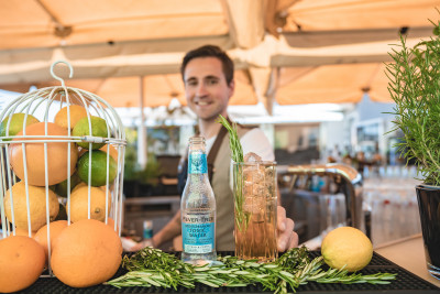 Barchef Tobias Cornelius mixt für seine neue Kreation, den ILLYRIUM, ein leicht kräutriger Highball mit Orangennote, getoppt mit Fever-Tree Mediterranean Tonic Water und garniert mit einem Rosmarin Zweig.