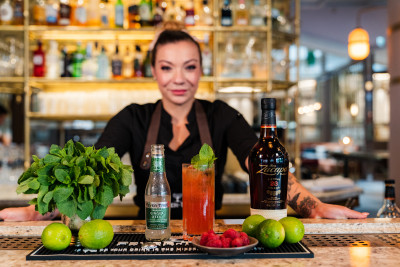 - 4cl Ron Zacapa, 5 Himbeeren, Minze und 1cl Limettensaft in einem Shaker zerstampfen. Shaken und ins Glas füllen.